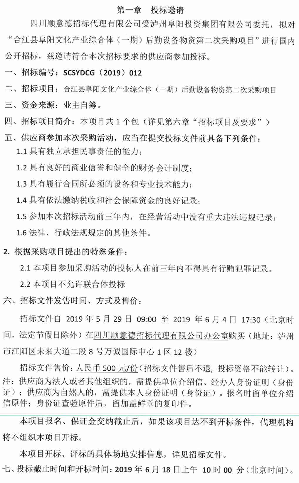合江縣阜陽文化產(chǎn)業(yè)綜合體(一期)后勤設(shè)備物資第二次采購項目